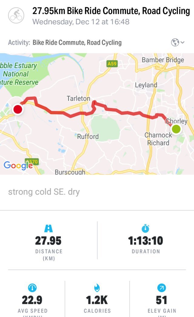 Fast commute: crystal clear sky and warm air, that generates a lot of energy. As I got near Whittington, the Freedom cycles group passed, so I joined. It was an informal ride for them but a fast commute for me. Some splits were 23mph.